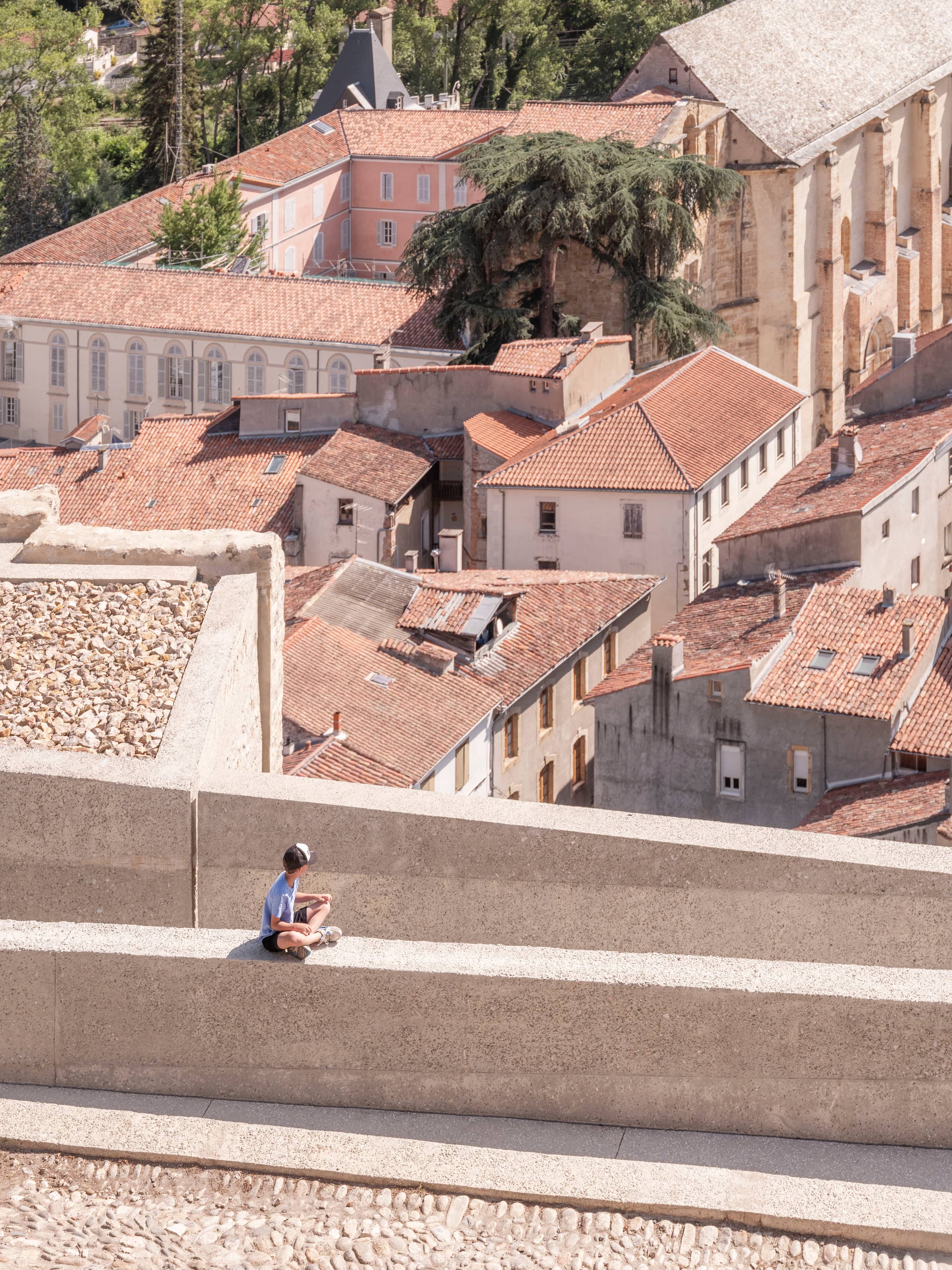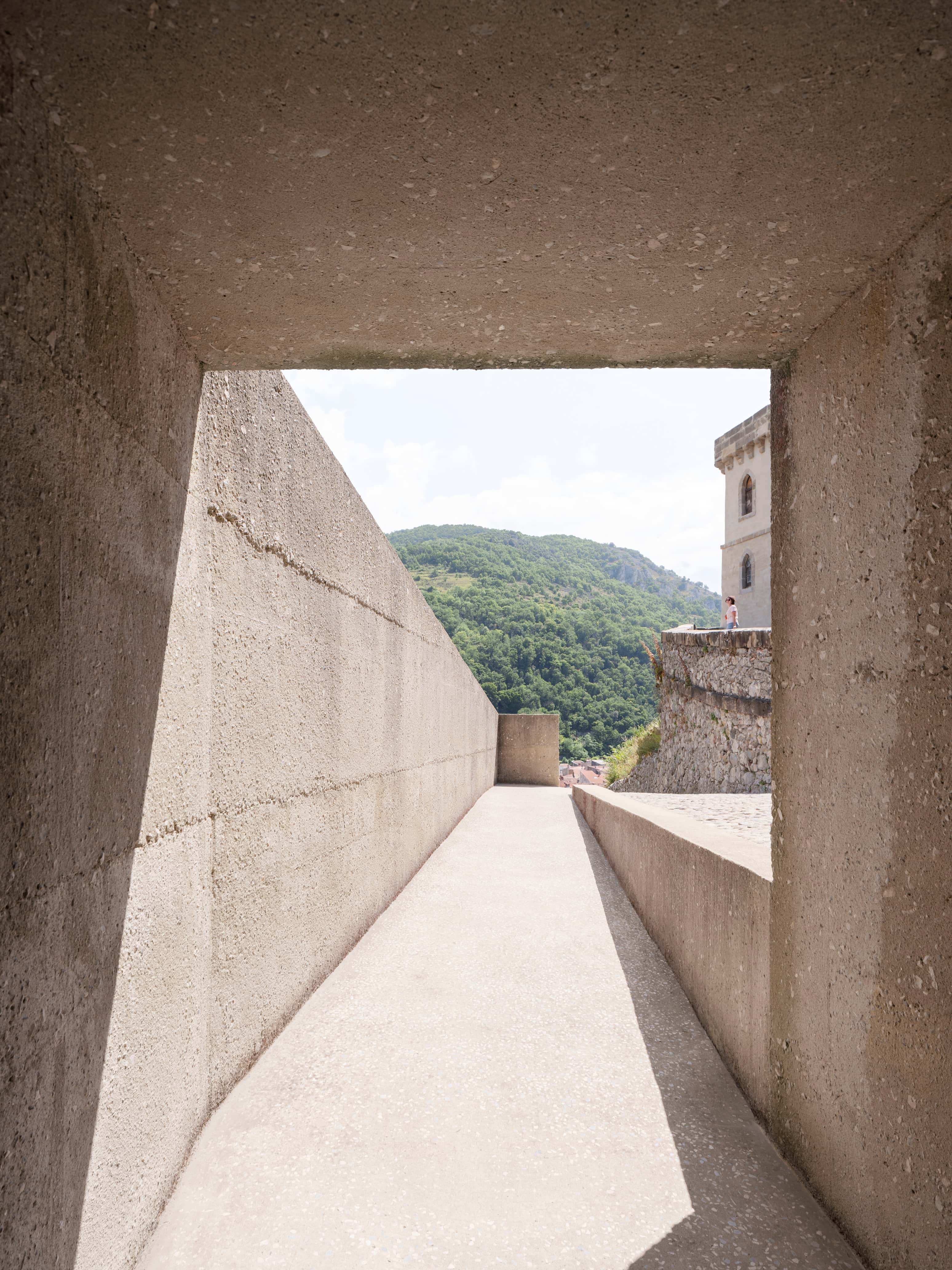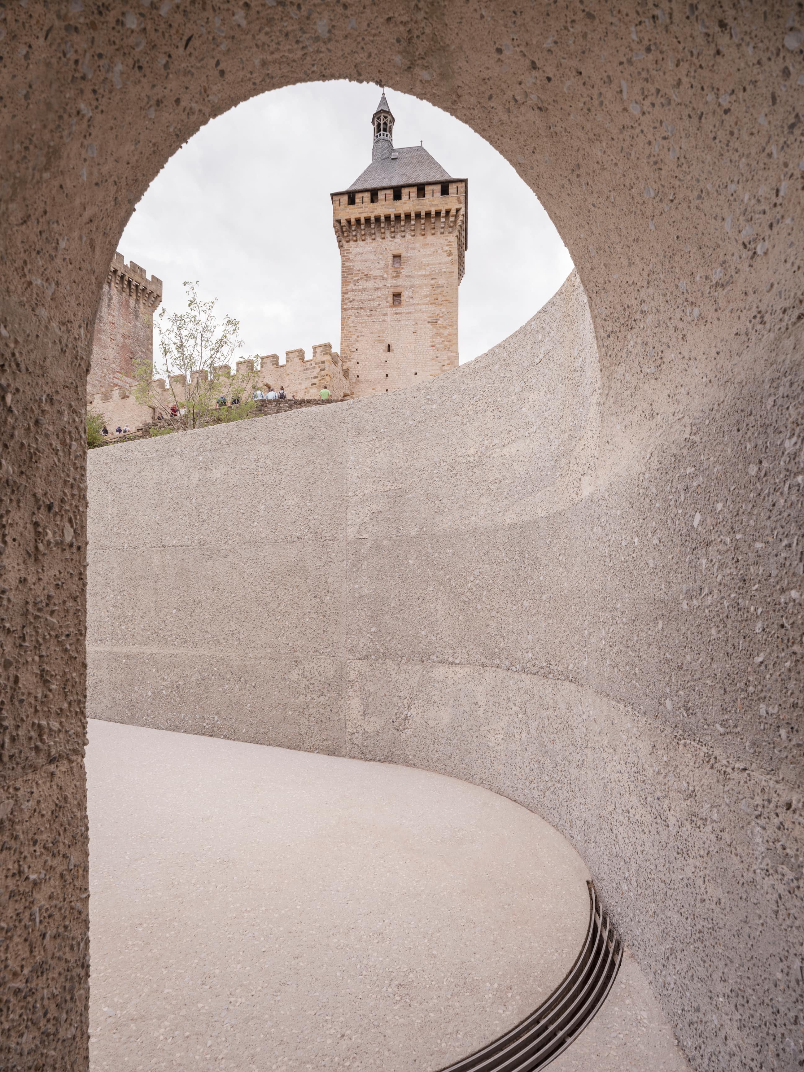 Le projet prend naissance au pied du château de Foix, qui surplombe la ville depuis son piton rocheux. Dans le but de redynamiser l’ouverture au public de ce site patrimonial emblématique de l’Ariège, l’intervention s’amorce dans la cour d’honneur du palais comtal réhabilité en musée, puis se déploie en hauteur sur le rocher jusqu’aux terrasses panoramiques du château.