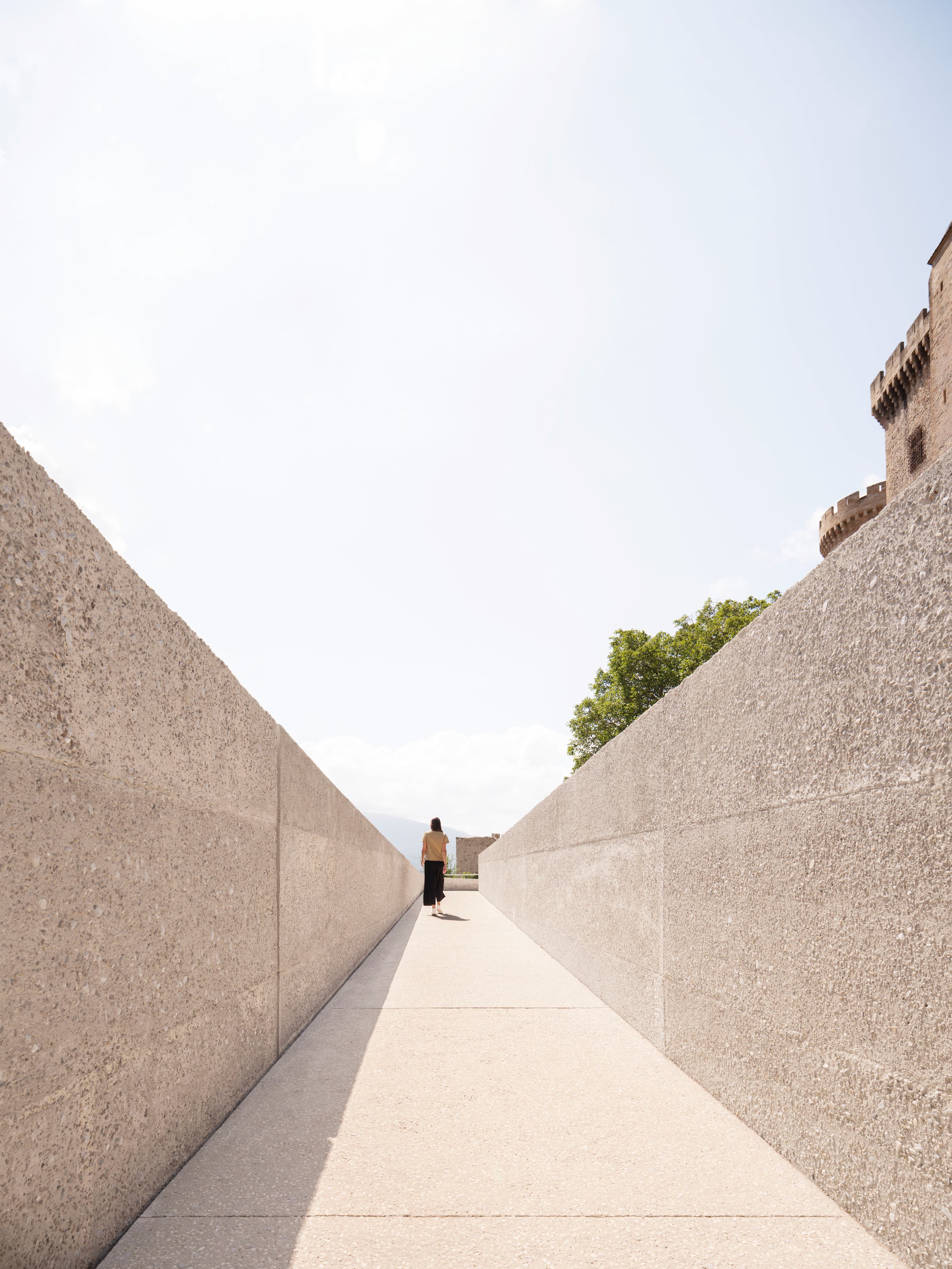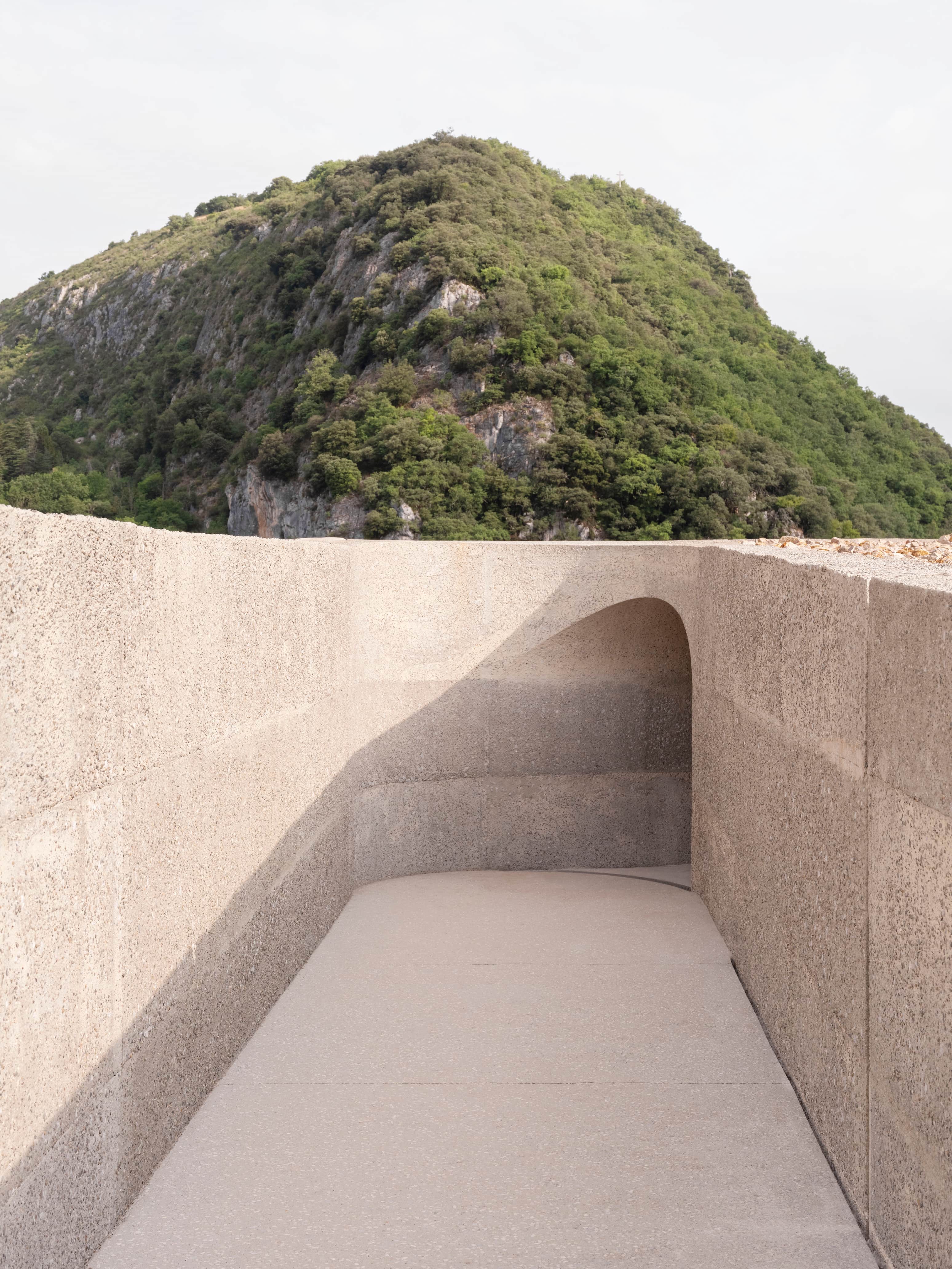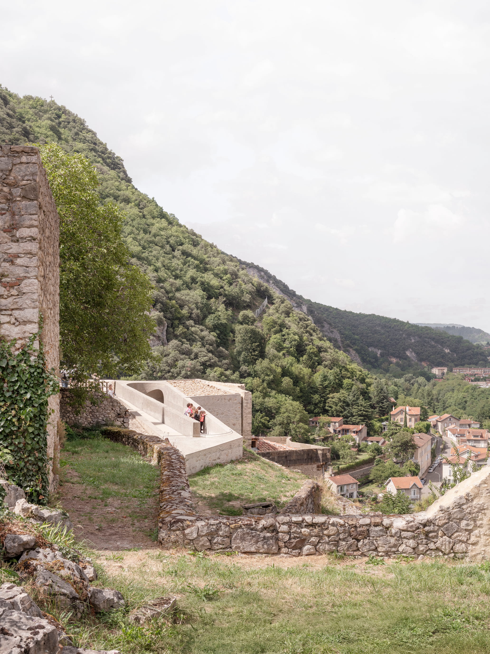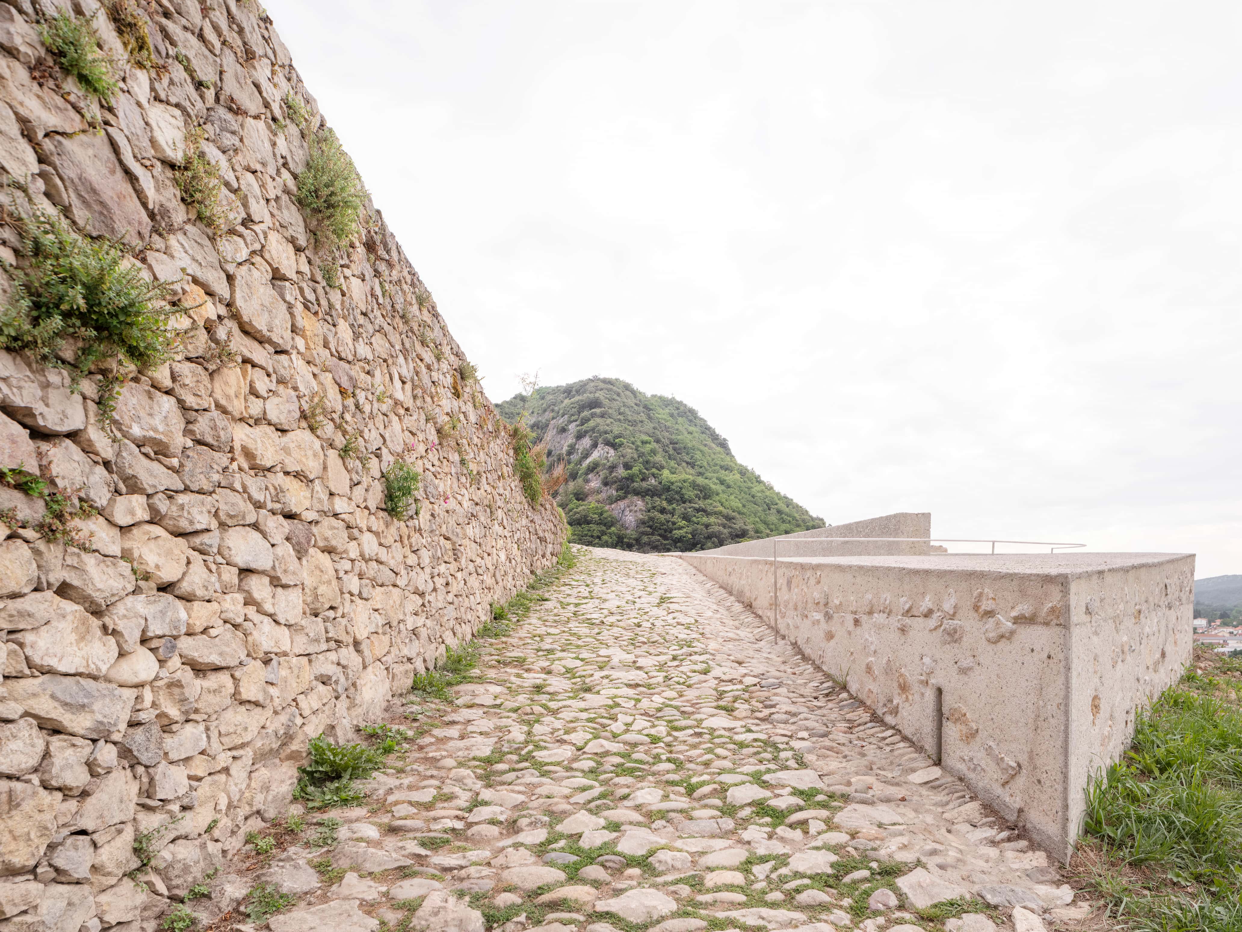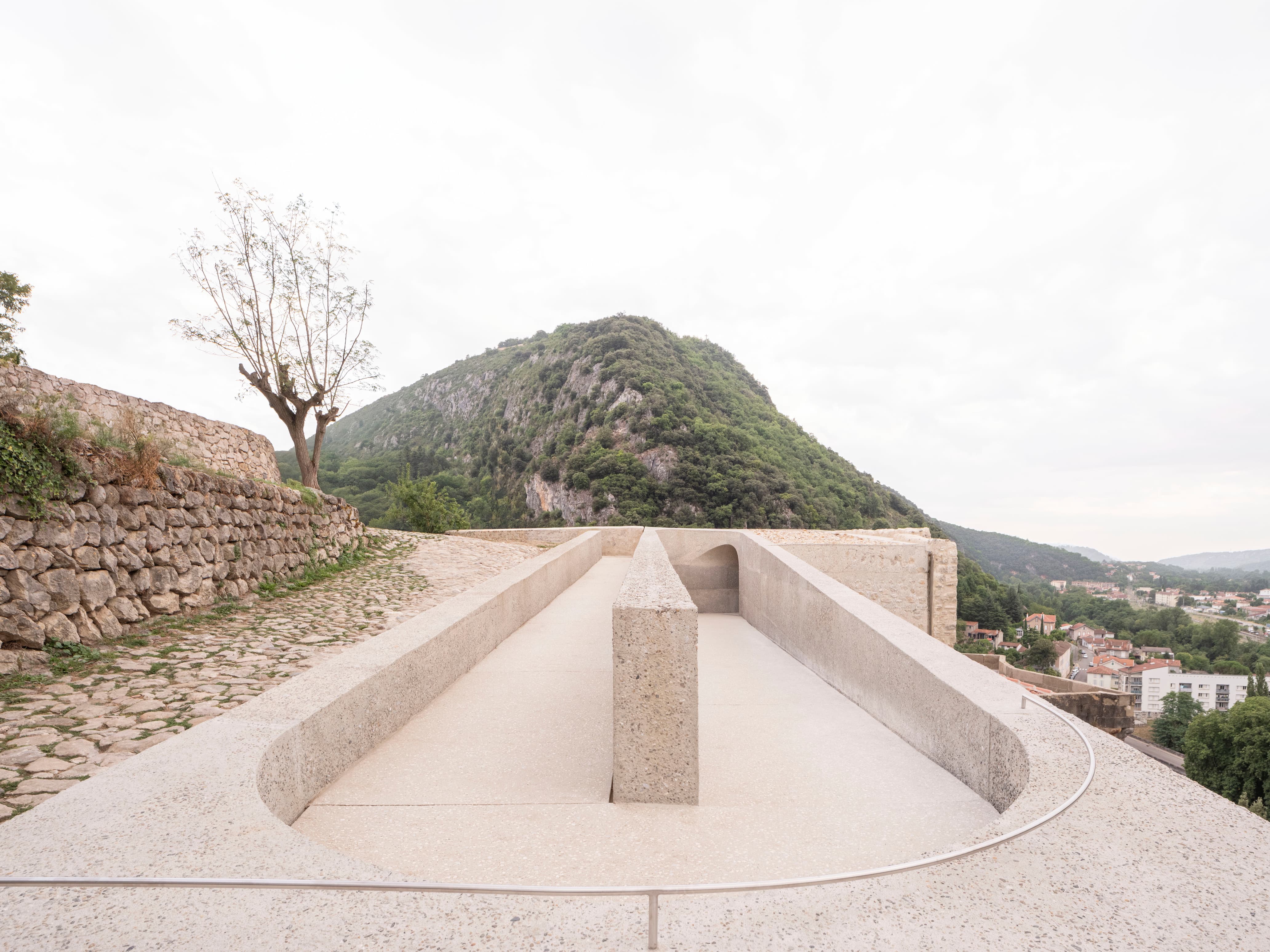 Leur nécessité fonctionnelle se double d’un rôle d’évocation des volumétries disparues ou altérées. La conception de ces ouvrages résulte d’un exercice d’intégration minutieux en vue d’impacter le plus faiblement possible l’image patrimoniale de ce site exceptionnel, et d’une intervention scénographique profitant de ce nouveau dispositif pour mettre en valeur les différents points de vue vers le paysage qui rythment l’ascension.