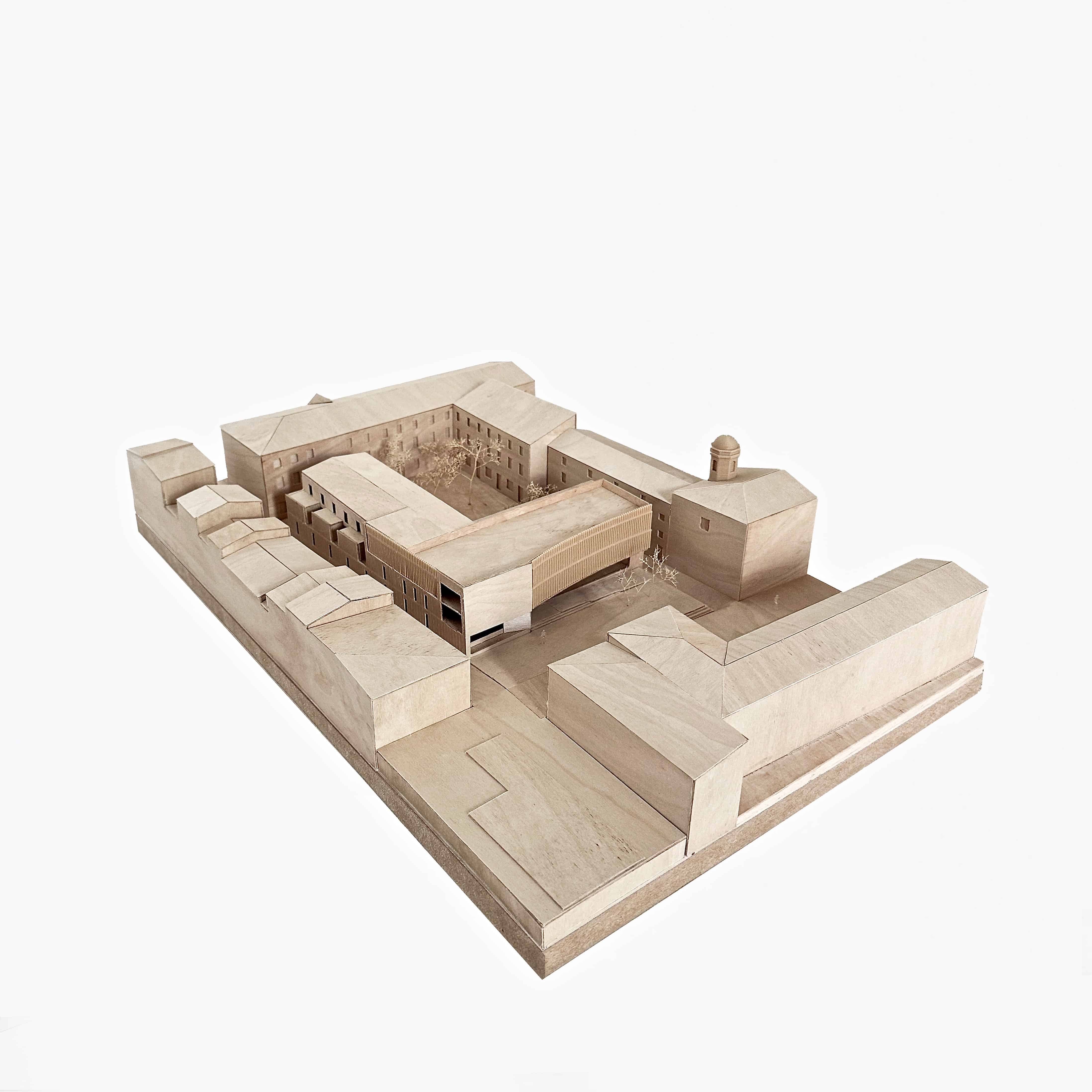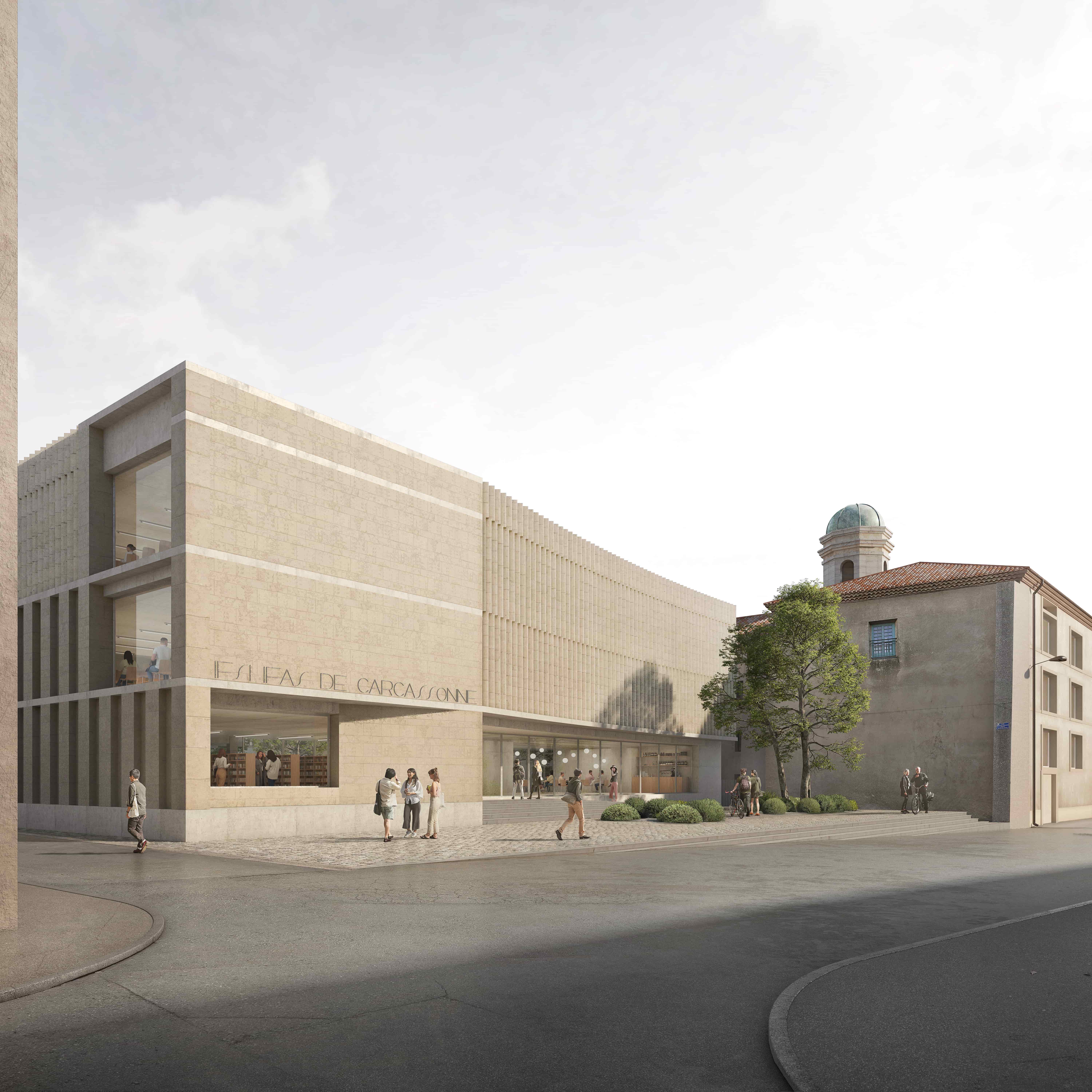 À la rencontre des différentes composantes du paysage urbain et de son histoire, le nouvel Institut de Formation en Soins Infirmiers et Institut de Formation des Aides Soignants de Carcassonne s’insère dans un site d’exception, au coeur même de la bastide construite par Saint Louis sur les vestiges des anciens bourgs détruits lors des croisades contre les Albigeois. Au-delà de venir compléter l’offre d’enseignement déjà présente et de consolider le dynamisme et l’attractivité du centre ancien de Carcassonne, le projet contribuera à apporter une nouvelle strate contemporaine à la ville. Il tiendra nécessairement un rôle fort et structurant non seulement à l’échelle de la bastide, mais aussi de la ville tout entière et de son territoire. Intervenir dans un tissus urbain historique aussi riche, dense et complexe est un privilège et une responsabilité qui nous oblige au plus grand soin et qui nous a animé tout au long de la conception. Si ce projet appelle au respect du contexte et à une certaine humilité, il oblige néanmoins à une véritable ambition, tant par ce qu’il va devoir représenter d’attractivité et de vie pour la ville et pour le territoire, que par la réponse qu’il doit apporter à la volonté de valoriser un patrimoine, et à l’audace des intentions du programme. Tout comme le sujet qu’il traite, l’apprentissage, la transmission des savoirs, dans l’exigeant et noble domaine de la santé, la formation des générations futures qui organisent et façonnent avec bienveillance et abnégation les « coulisses de la vie ». Il doit être exemplaire pour favoriser de tels choix à l’avenir. Pour toutes ces raisons, nous avons voulu donner à ce projet une identité forte et valorisante, une présence bienveillante et chaleureuse.