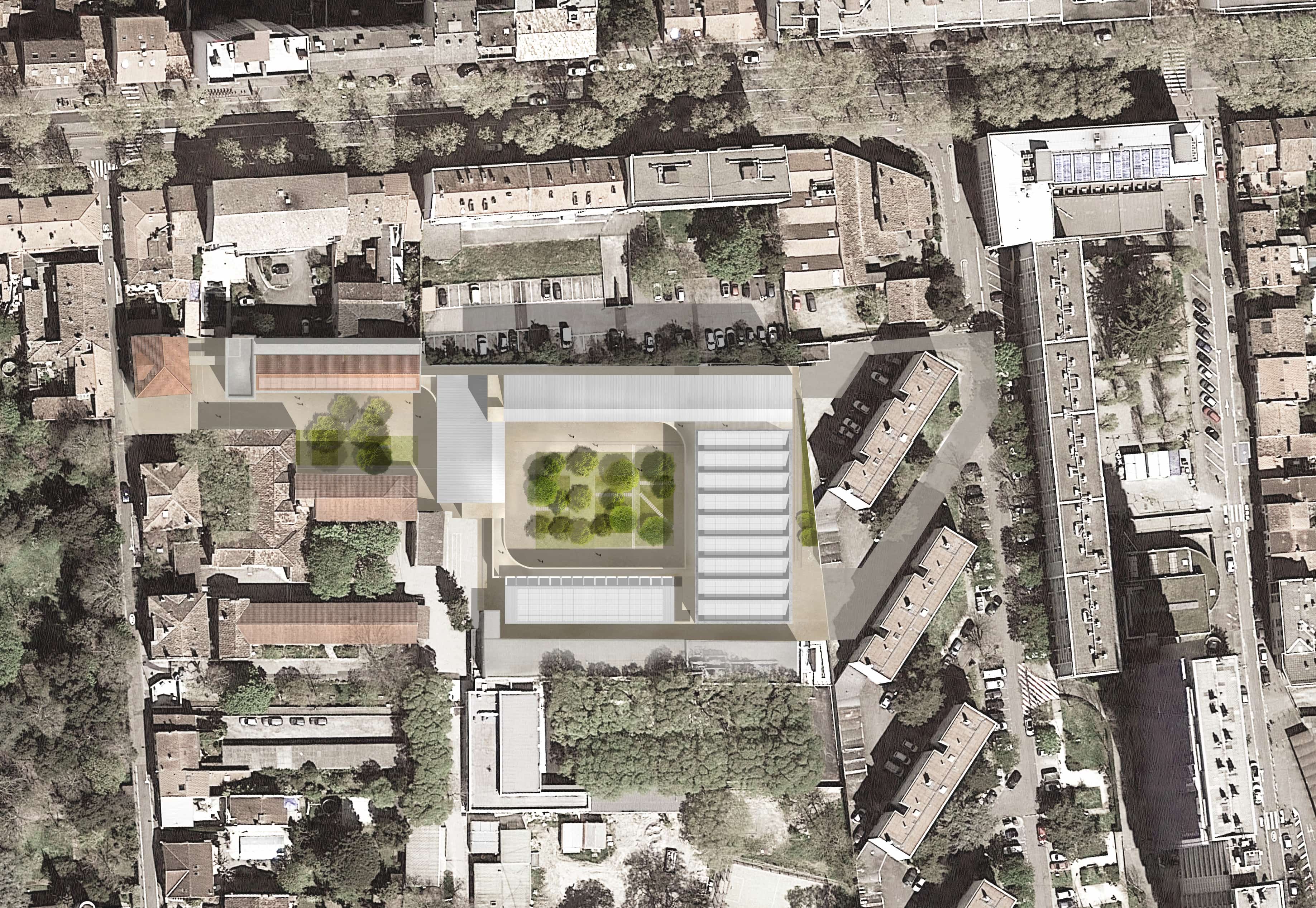 et primaire, nichées dans un grand jardin. Le futur collège s’inscrit dans cette préexistence et sa présence doit suivre la logique de l’esprit des lieux. Tout autour, voisinent des bâtiments de style et de dimensions très différents. La cité Roguet en est un exemple des plus frappants. Loin d’être un handicap, ils sont une richesse qui invite à créer un équipement qui pourra remplir le rôle de chainon manquant dans cette diversité et répondre à ces différentes situations.